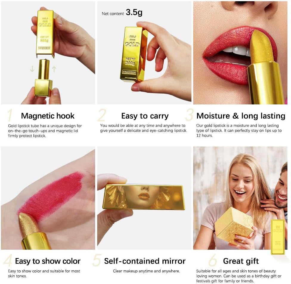 شكل ذهبي فريد: أنيق للغاية، مبتكر، مناسب لجميع الأعمار ودرجات البشرة للنساء المحبات للجمال، أحمر الشفاه الذهبي يعطي الرطوبة لشفتيك دون ترك شفتيك تشعر بالجفاف. يمكن استخدامه كهدية عيد ميلاد أو هدية احتفالية للعائلة أو الأصدقاء، ولكن أيضًا بحجم صغير وخفيف الوزن، يمكنك وضعه في حقيبة أو حقيبة سفر، لا حاجة إلى مساحة أكبر، أحمر الشفاه الذهبي هو نوع مرطب ويدوم طويلاً من أحمر الشفاه. يمكن أن تبقى على الشفاه بشكل مثالي حتى 12 ساعة