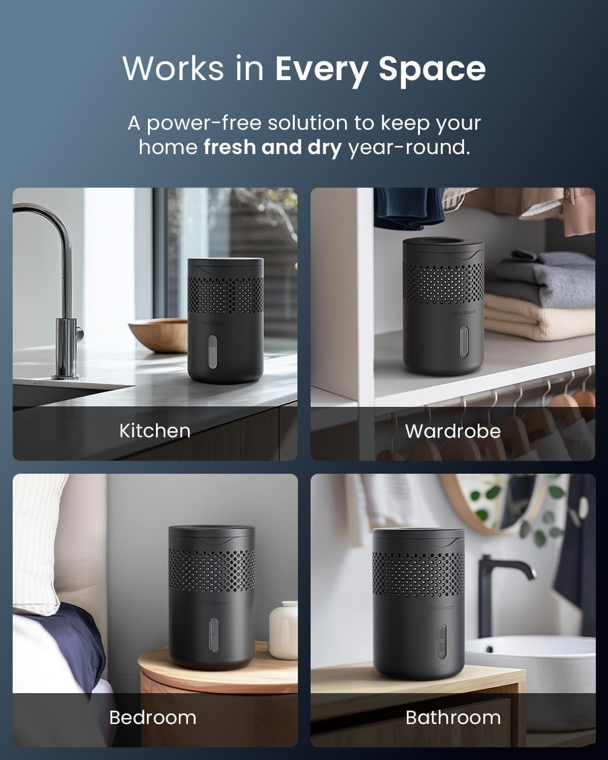 سريع المفعول ويدوم طويلاً: على عكس مزيلات الرطوبة الأخرى للمنزل، يستخدم ممتص الرطوبة الخاص بنا قرصًا كبيرًا جدًا 700 غرام بدلاً من الكريستالات لإزالة الرطوبة من مساحتك بشكل أسرع وأطول (حتى 100 يوم). مع عدم وجود طبقة إضافية ومساحة سطح كبيرة، فإنه يزيل الرطوبة من الداخل أكثر بكثير من المنافسين.
