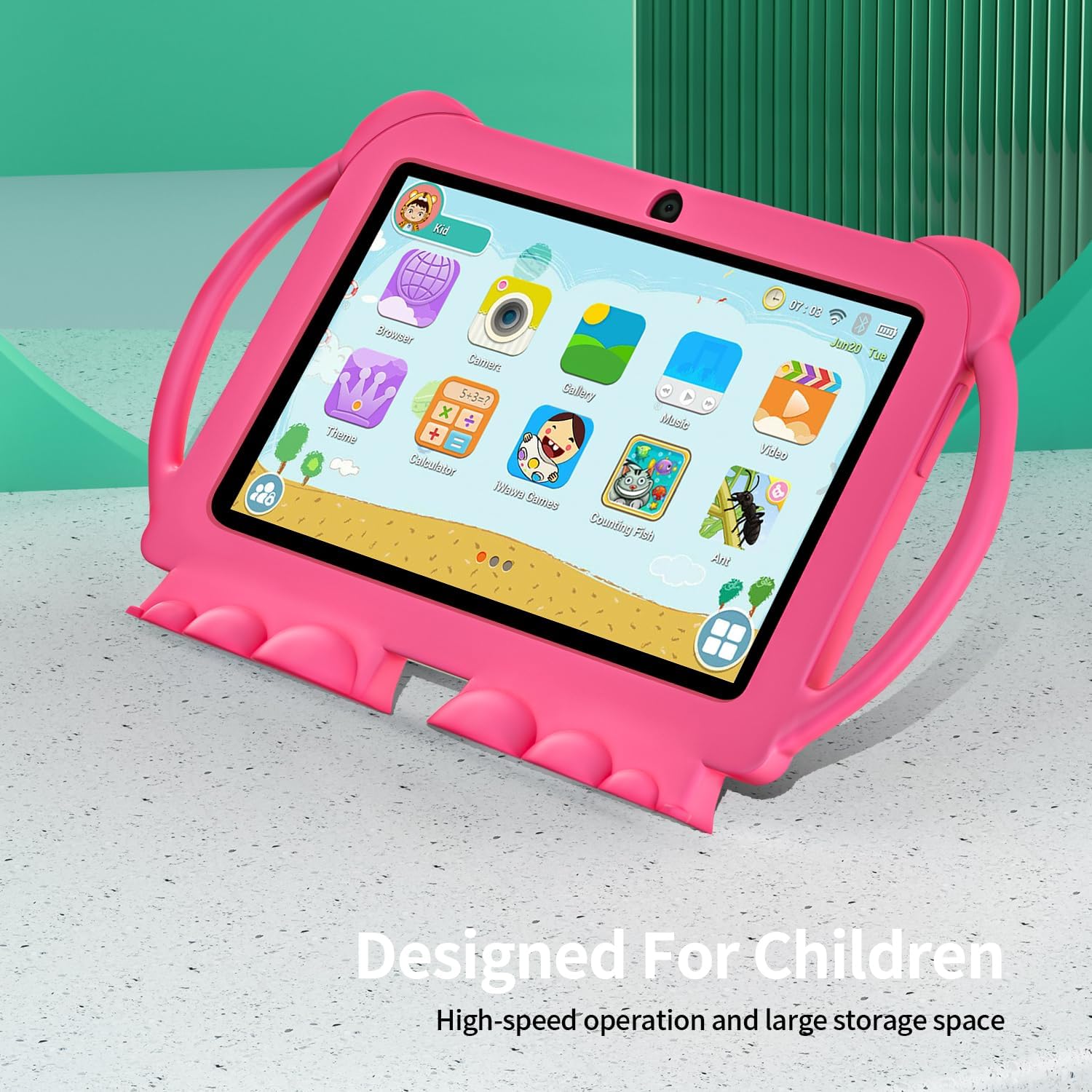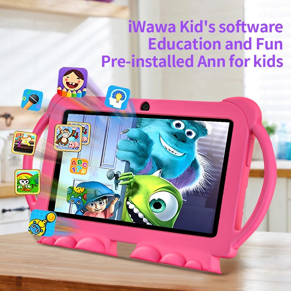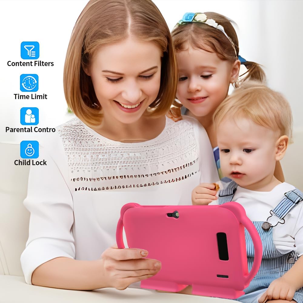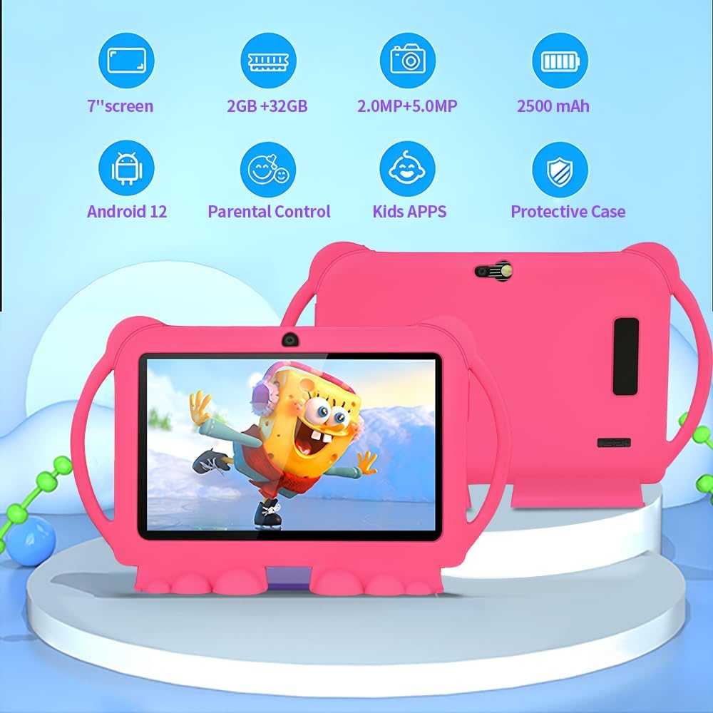 تابلت للاطفال 7 انش، رباعي النواة اندرويد 12 2 جيجا 32 جيجا، تحكم ابوي، حماية العين، حافظة مضادة للصدمات، كاميرا مزدوجة، واي فاي، بلوتوث، تابلت تعليمي للاطفال – K5 (زهري)