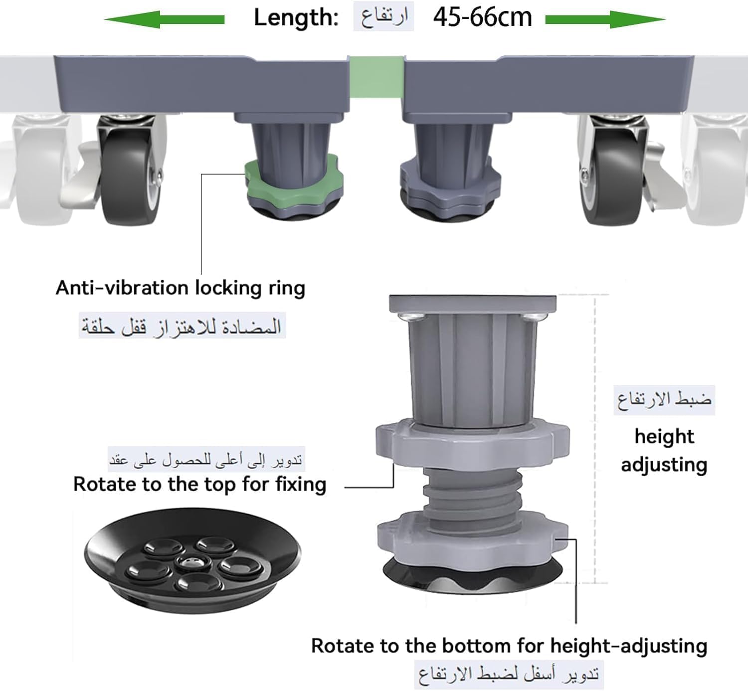 عجلة دوارة 360 درجة: تحتوي هذه القاعدة المتحركة على 4 قطع من العجلات المطاطية بزاوية 360 درجة والتي يمكن أن تدور بسهولة 360 درجة حتى مع الأشياء الحاملة، مما يساعدك على نقل الماكينة أو الأثاث بسهولة إلى المكان الذي تريده. ولن تتلف العجلة المطاطية الأرضية والسجاد. يحتوي كل زوج من العجلات على مشبك فرامل، تحتاج فقط إلى الضغط لقفل العجلات لمنع أسطوانة الغسالة من التحرك عن طريق الخطأ