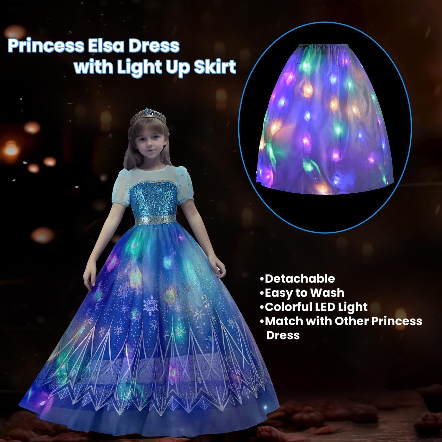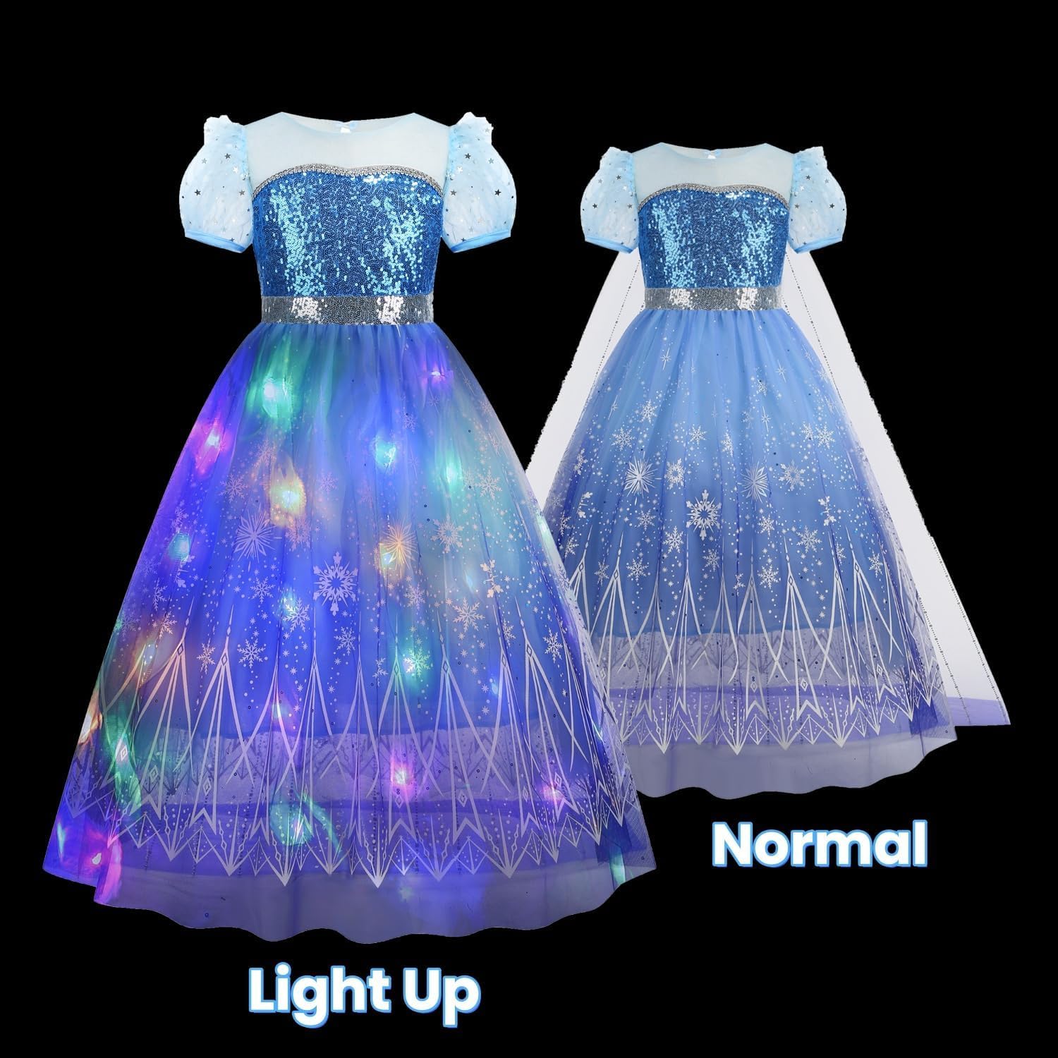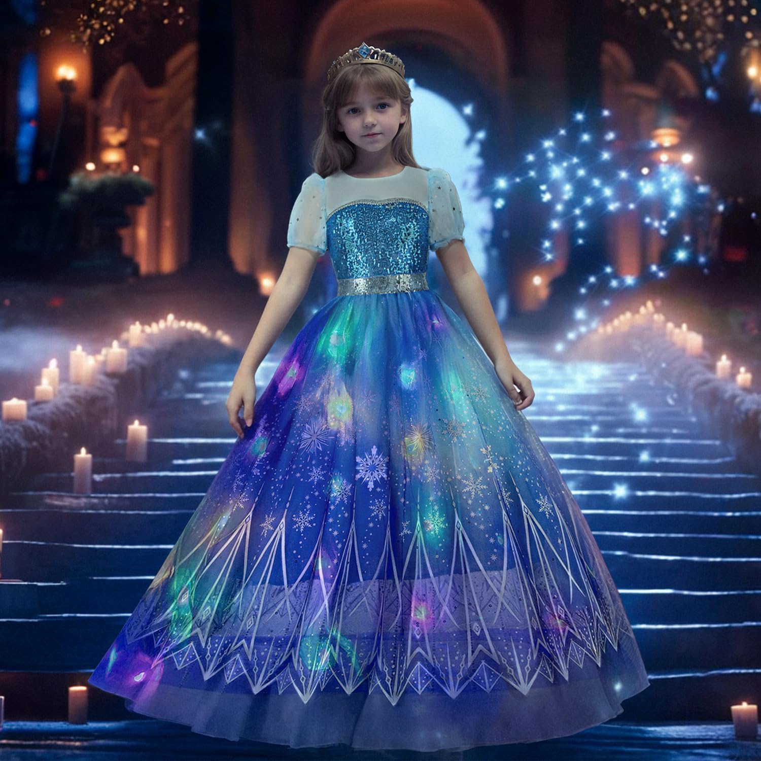 فستان الأميرة المضيء للبنات، جمال السا النائم مع فستان LED، زي الأميرة الجليد والثلج للكرنفالات والحفلات التنكرية وأعياد الميلاد