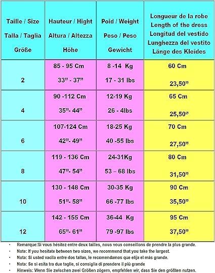 المقاسات: – المقاس 1 = القامة: 70/85 سم – طول الفستان: 53 سم – المقاس 2 = القامة: 85/95 سم – طول الفستان: 60 سم – مقاس 4 = القامة: 90 سم/ 1.12 م – طول الفستان: 65 سم. المقاس 6 = القامة: 1.07/1.24 م – طول الفستان: 70 سم – مقاس 8 = القامة: 1.19/1.36 م – طول الفستان: 80 سم – مقاس 10 = القامة: 1.30/1.48 م – طول الفستان: 88 سم – مقاس 12 المملكة المتحدة – القامة: 1.42/1.55 م – طول الفستان*: 95 سم* ملاحظة حول طول الفستان: يتم قياس طول الفستان على الجزء الأمامي من الثوب، من خط العنق عند الكتفين إلى الحافة السفلية.