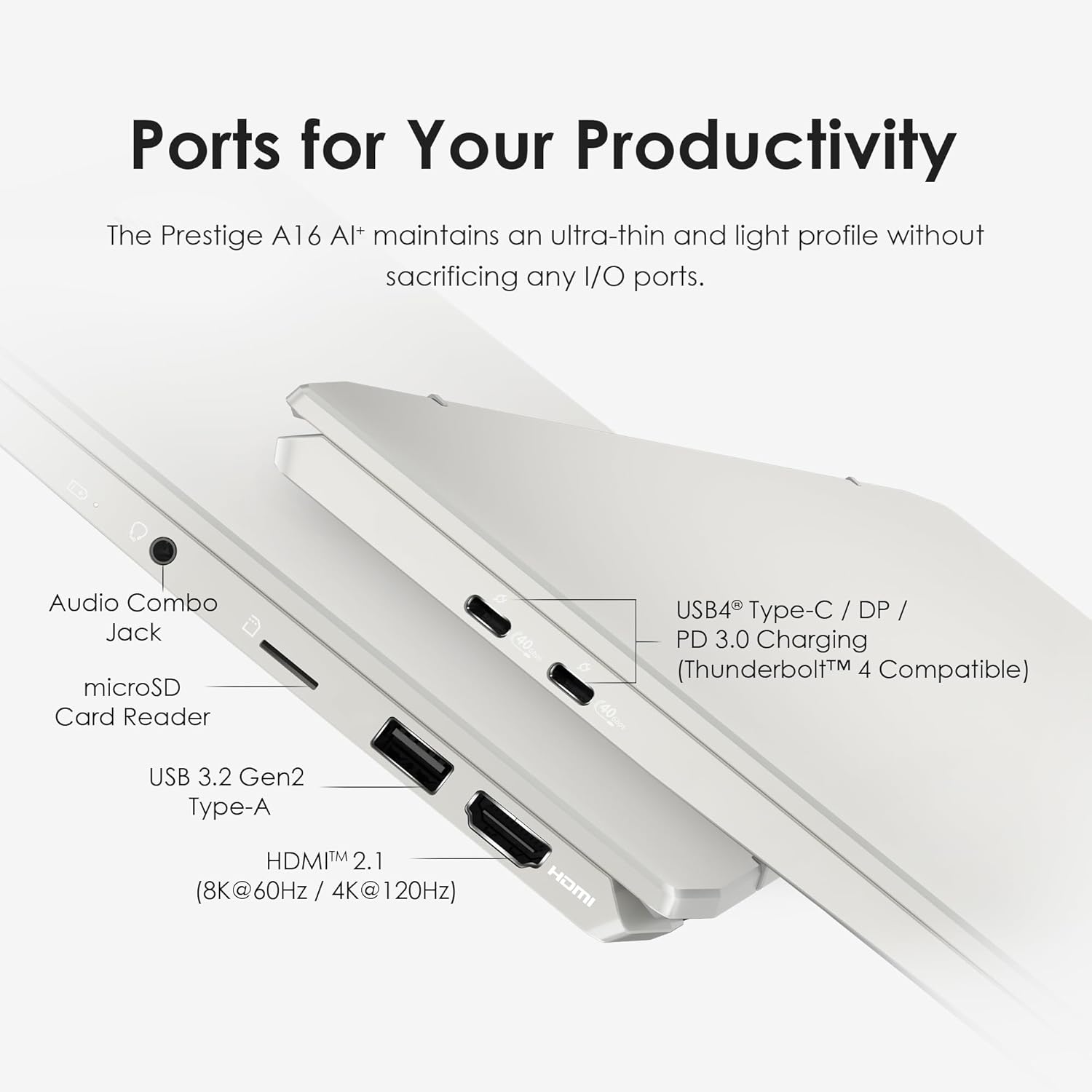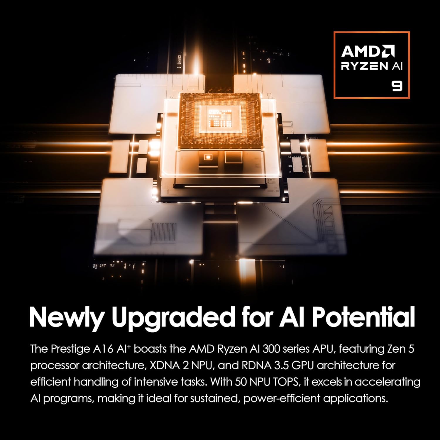MSI لابتوب برستيج A16 AI+ (2024) 16 انش QHD+ للاعمال: AMD رايزن AI 9-365، بطاقة رسومات راديون، 32GB LPDDR5x، ذاكرة مستديمة SSD 1TB، نوع C، واي فاي 7، ويندوز 11 هوم: اوربان سيلفر A3HMG-016US