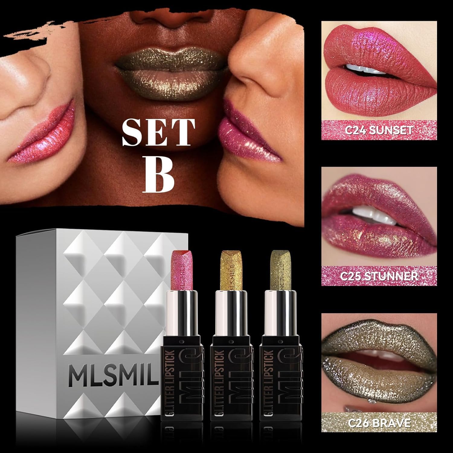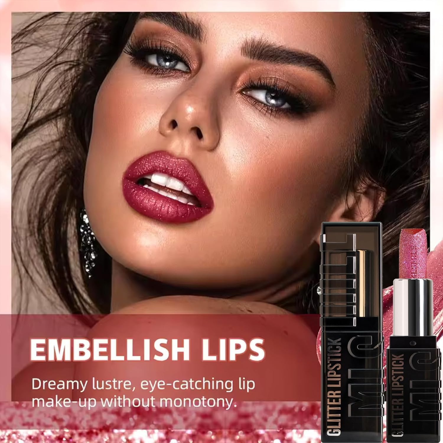 Stunning Shimmer Metallic Finish: This dazzling metallic lipstick set features a high-shine, glitter-infused formula that delivers a radiant, eye-catching sparkle