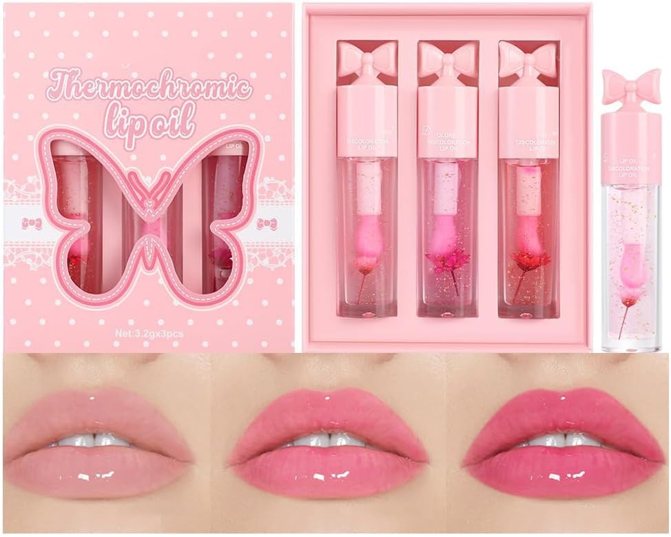 شراء 3Pcs Color Changing Lip Oil Set, with Flowers and Gold Foil, PH Thermochromic Mood Lip Gloss, Hydrating Magic Lipstick, Long Lasting Moisture Tint Balm, Clear to Pink Color Shift Lipgloss for Women اون لاين من امازون او نون 3Pcs Color Changing Lip Oil Set, with Flowers and Gold Foil, PH Thermochromic Mood Lip Gloss, Hydrating Magic Lipstick, Long Lasting Moisture Tint Balm, Clear to Pink Color Shift Lipgloss for Women