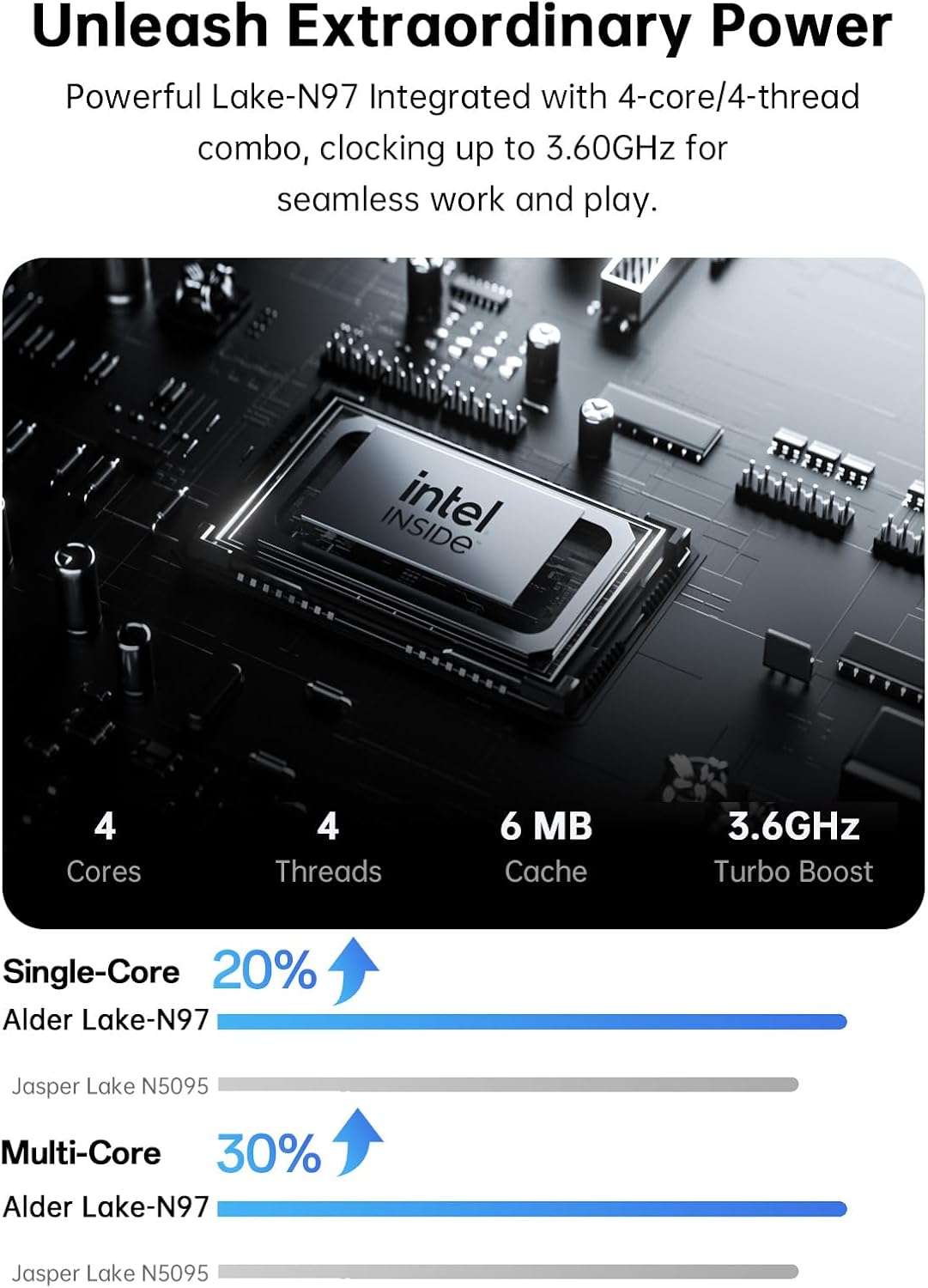 CPU: 12th Alder Lake N97 Quad-Core Processor (4 Cores, 4 Threads, 6MB Cache, Base Frequency 1.7 GHz, Up to 3.60 GHz with Turbo Boost Technology)