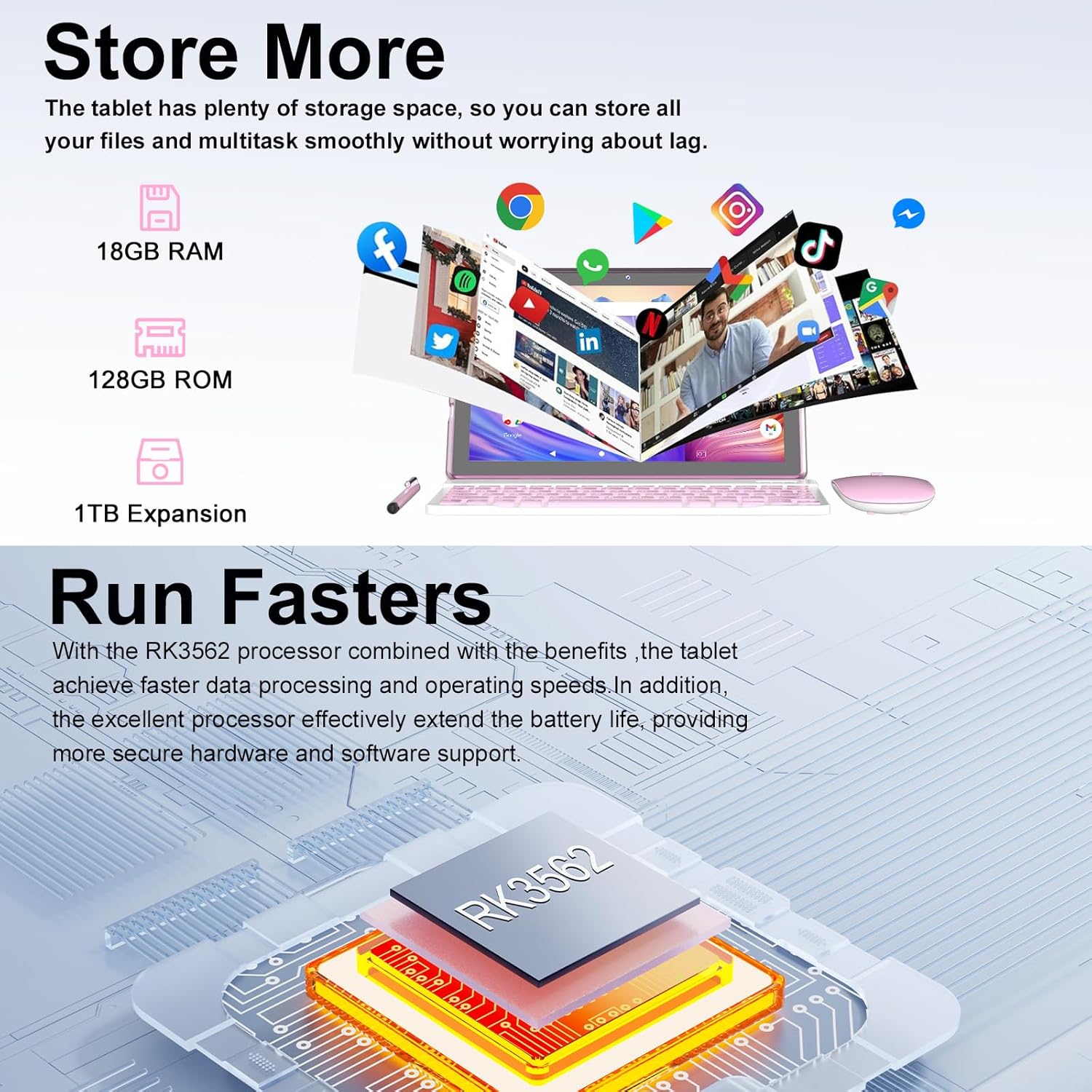 【18GB RAM+128GB ROM+1TB Expandable】 Our android 15 tablet PC built-in a powerful storage combination of 18GB RAM ( 4GB + 14GB achieved through expansion technology ) and 128GB ROM, comes with new generation ultra-high performance and low power consumption 2.0GHz Processor, achieve faster and more stable running and storage speeds. In addition, it can be expanded up to 1TB with a microSD card (card not included) for even more storage.
