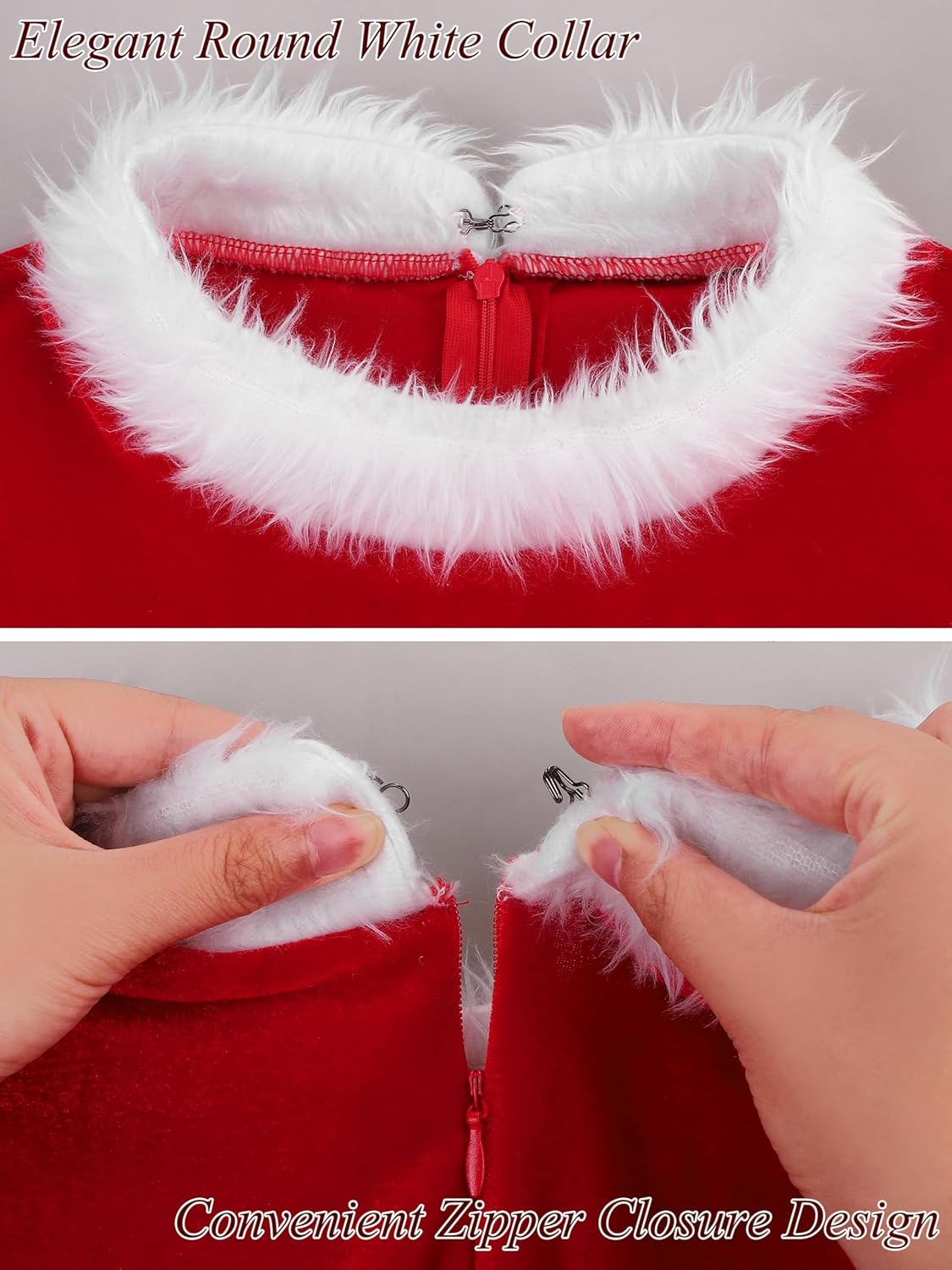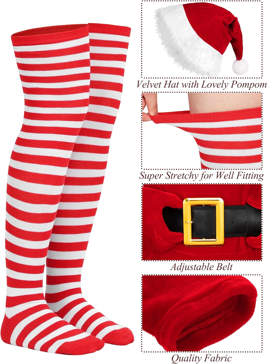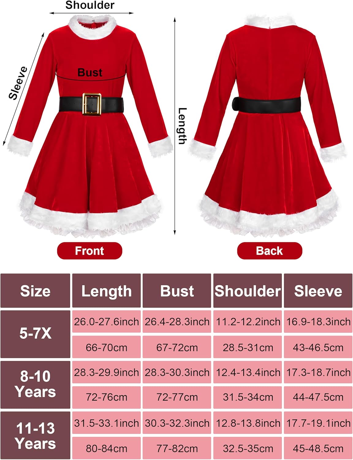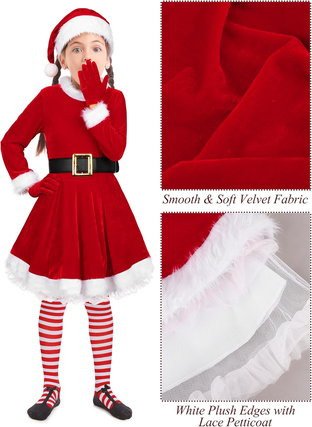 AOTHSO 5 Pack Girls Christmas Santa Suit Dress Velvet Dress Costume with Belt Over Knee Socks Hat Gloves Santa Claus Cosplay