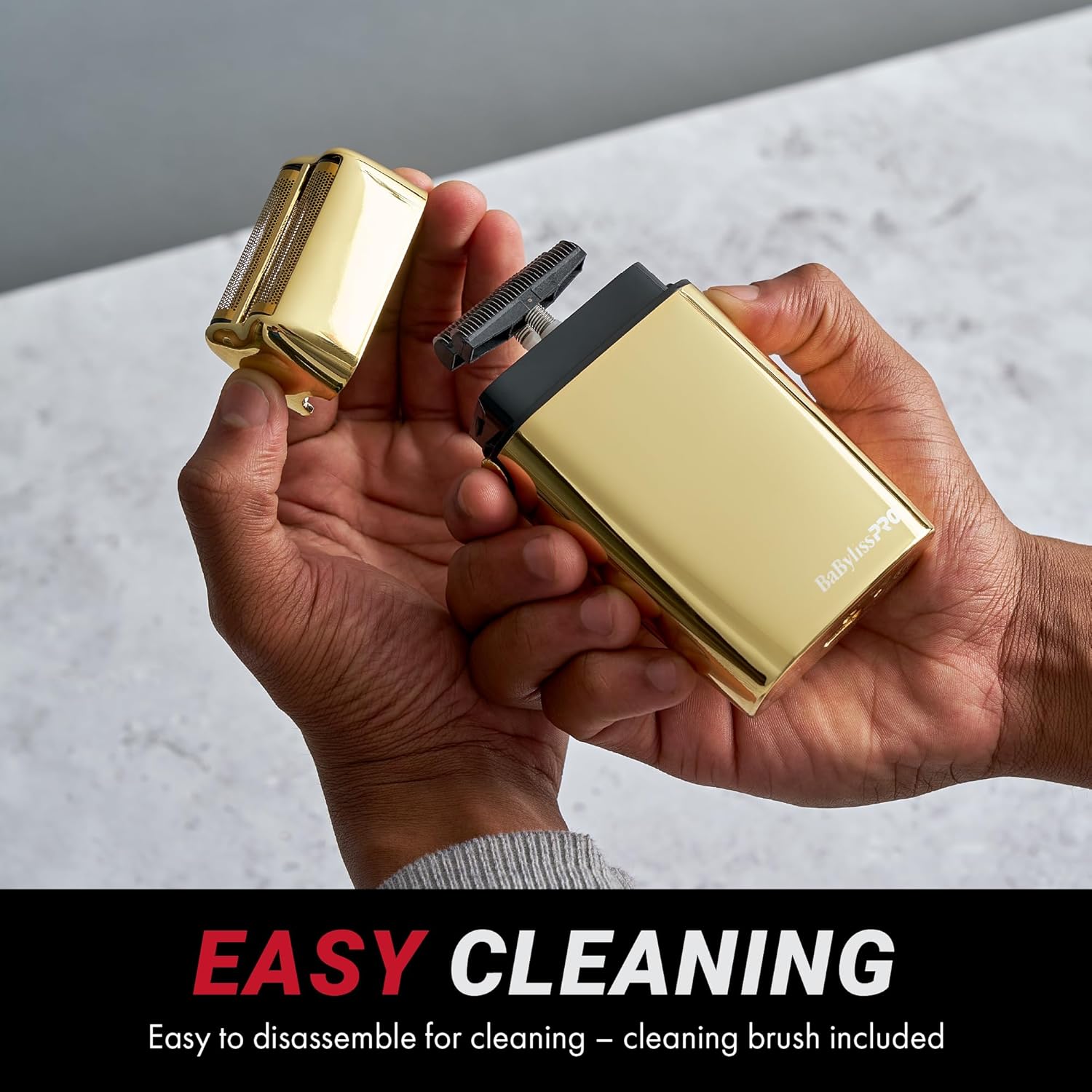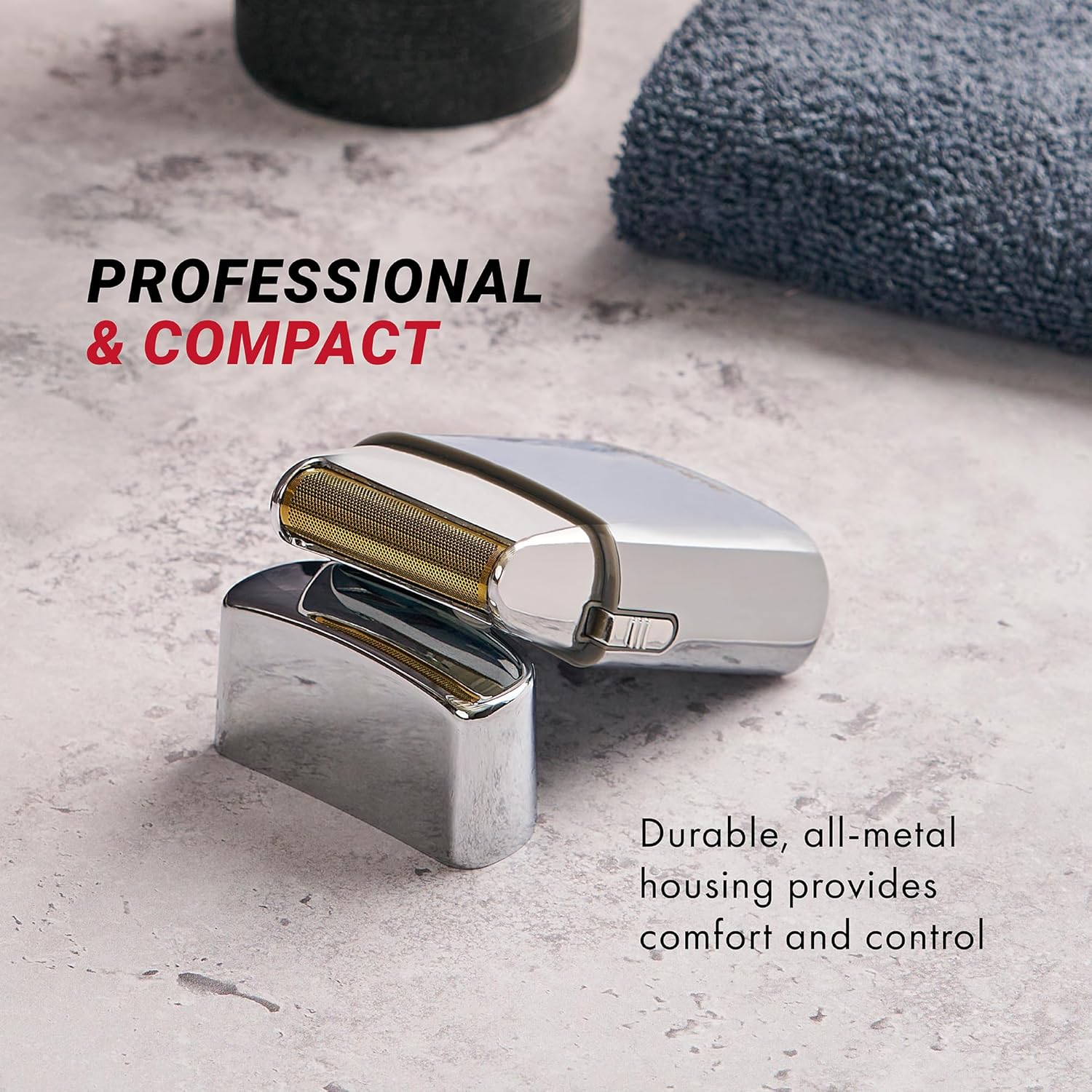 The BaBylissPRO FOILFX01 cordless shaver is a professional, compact-size metal foil shaver equipped with a single, hypoallergenic gold foil. It comes with a storage pouch & 2 AA batteries.