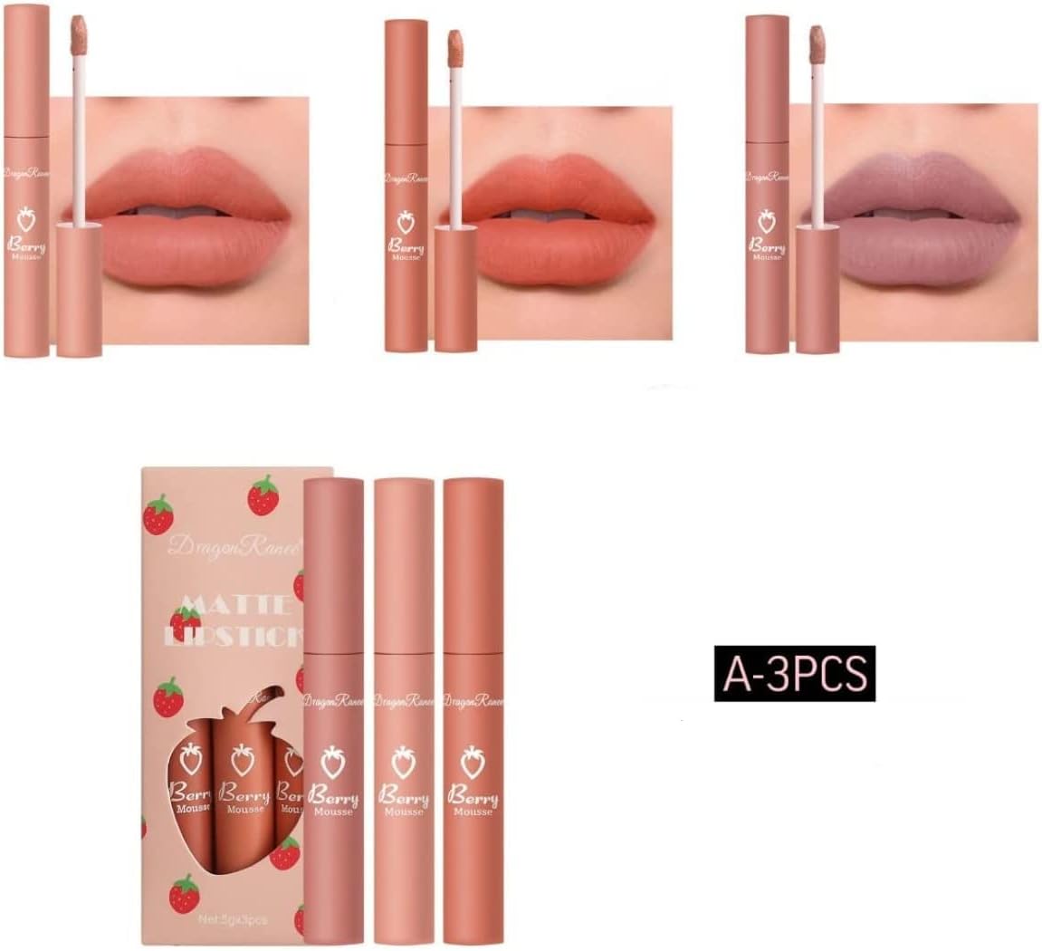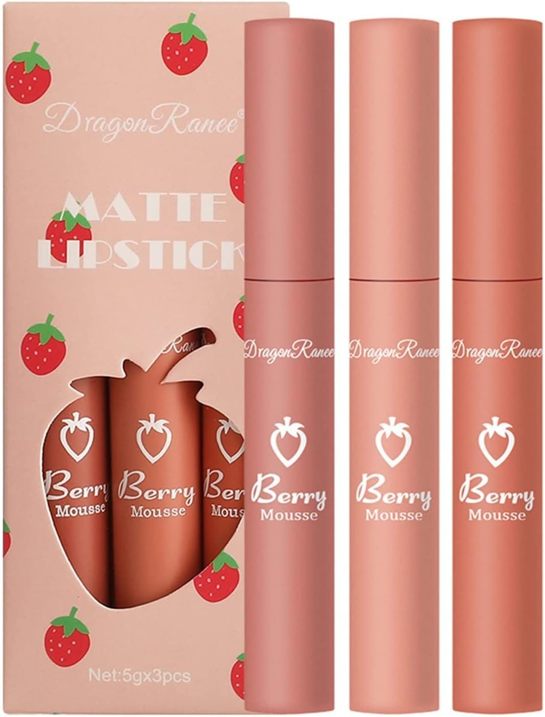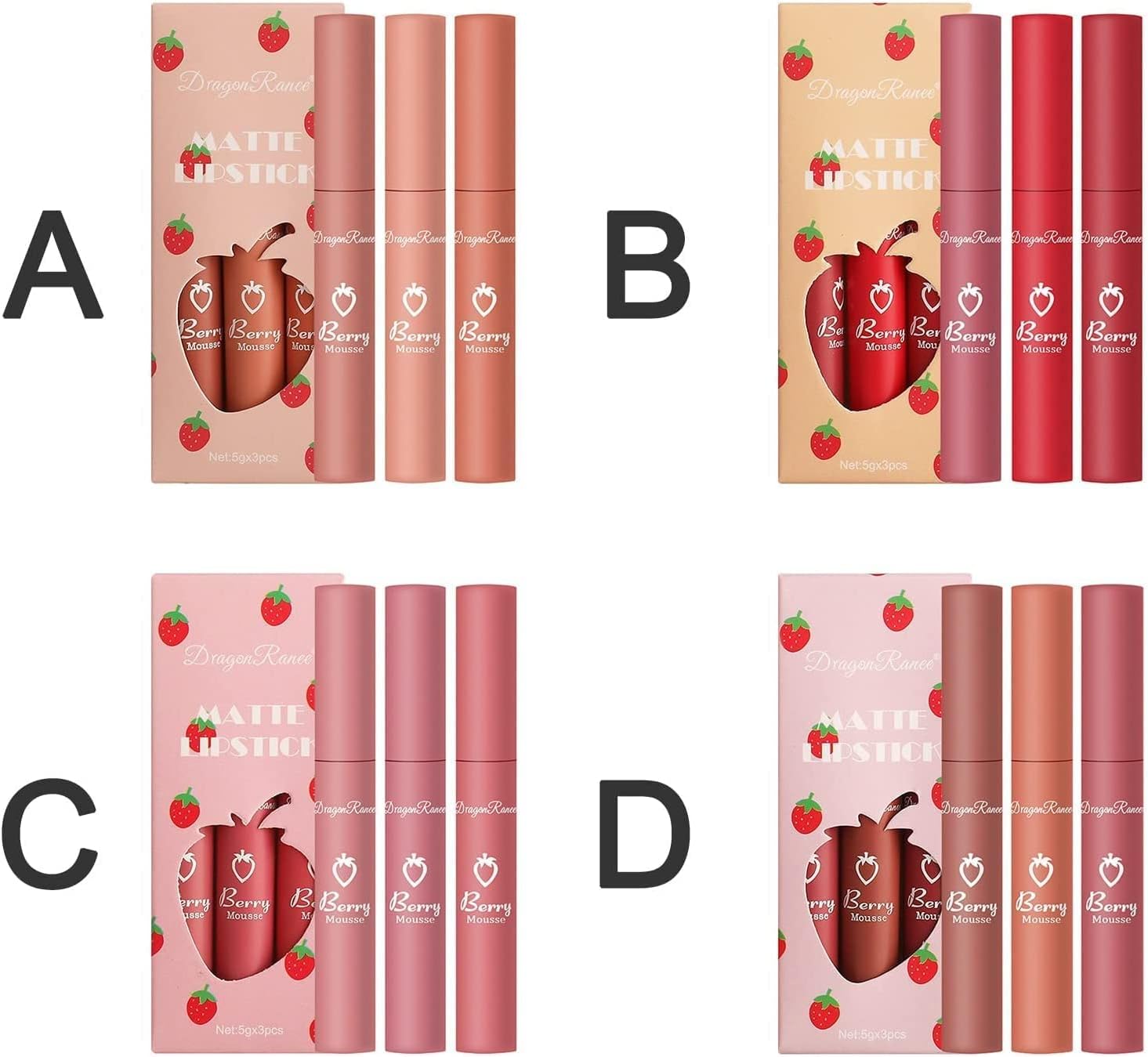 3Pcs Strawberry Set Matte Liquid Lipstick Makeup Set, Long Lasting Lip Gloss Non-Stick Cup is Not Easy to Fade, Waterproof Matte Lip Glaze Lipstick Set Box Girls Women Make Up Gift Set