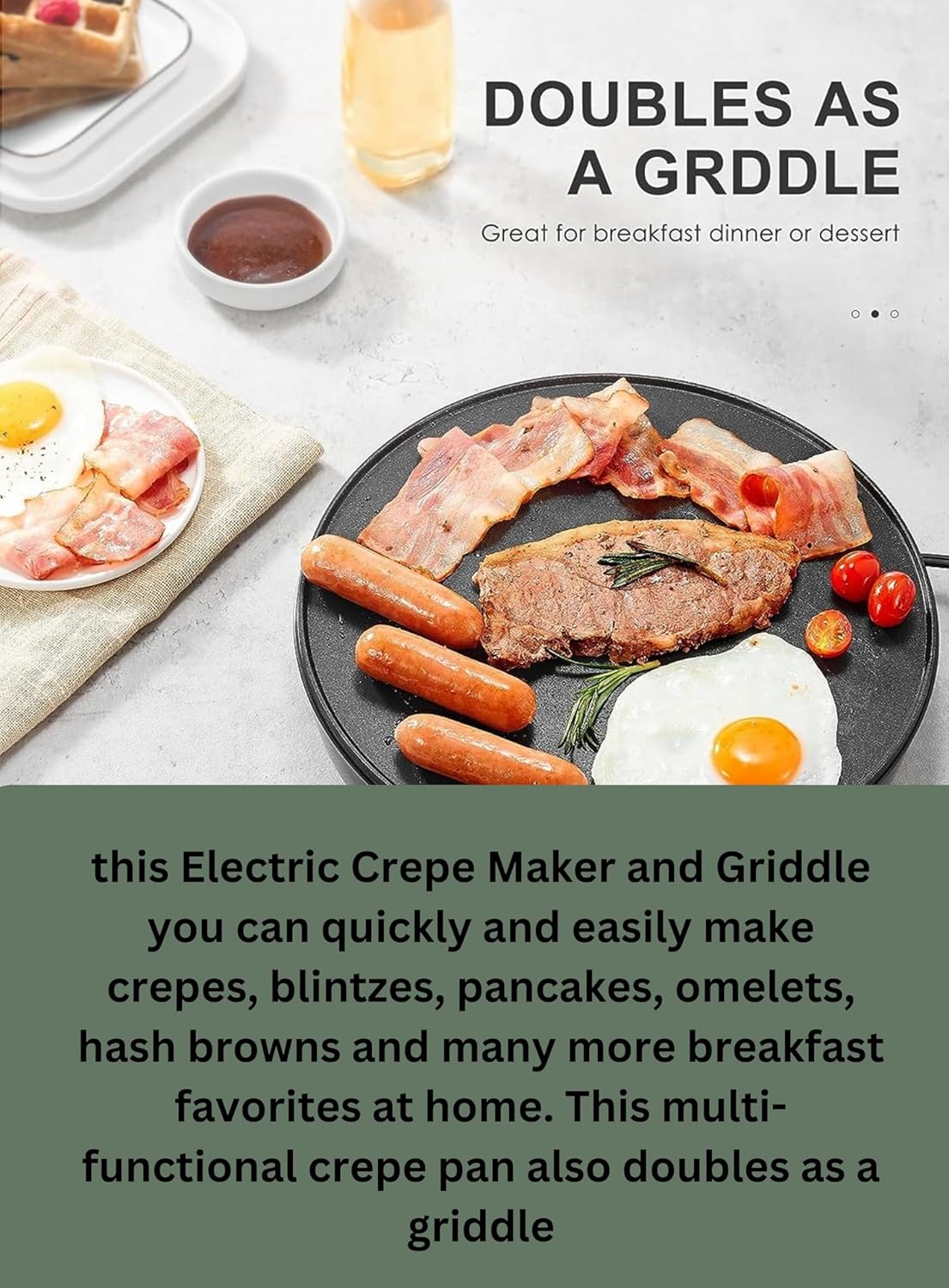 استخدام متعدد الاستخدامات: بالإضافة إلى صنع الكريب، يعد هذا الجهاز مثاليًا لتحضير مجموعة متنوعة من الأطعمة، بما في ذلك البانكيك والبلينتز والأملت والمزيد. تنوعه يجعله إضافة أساسية لأي مطبخ.