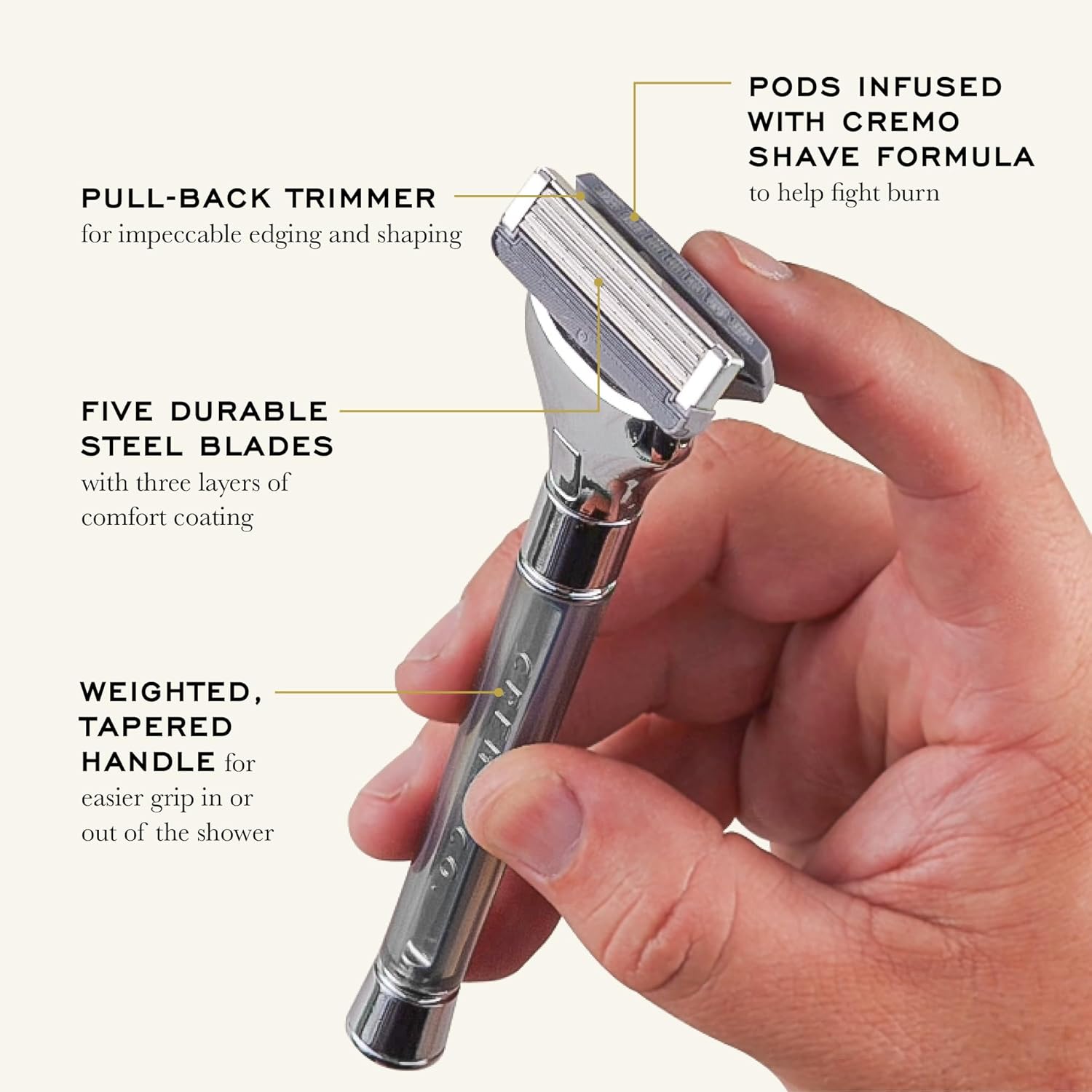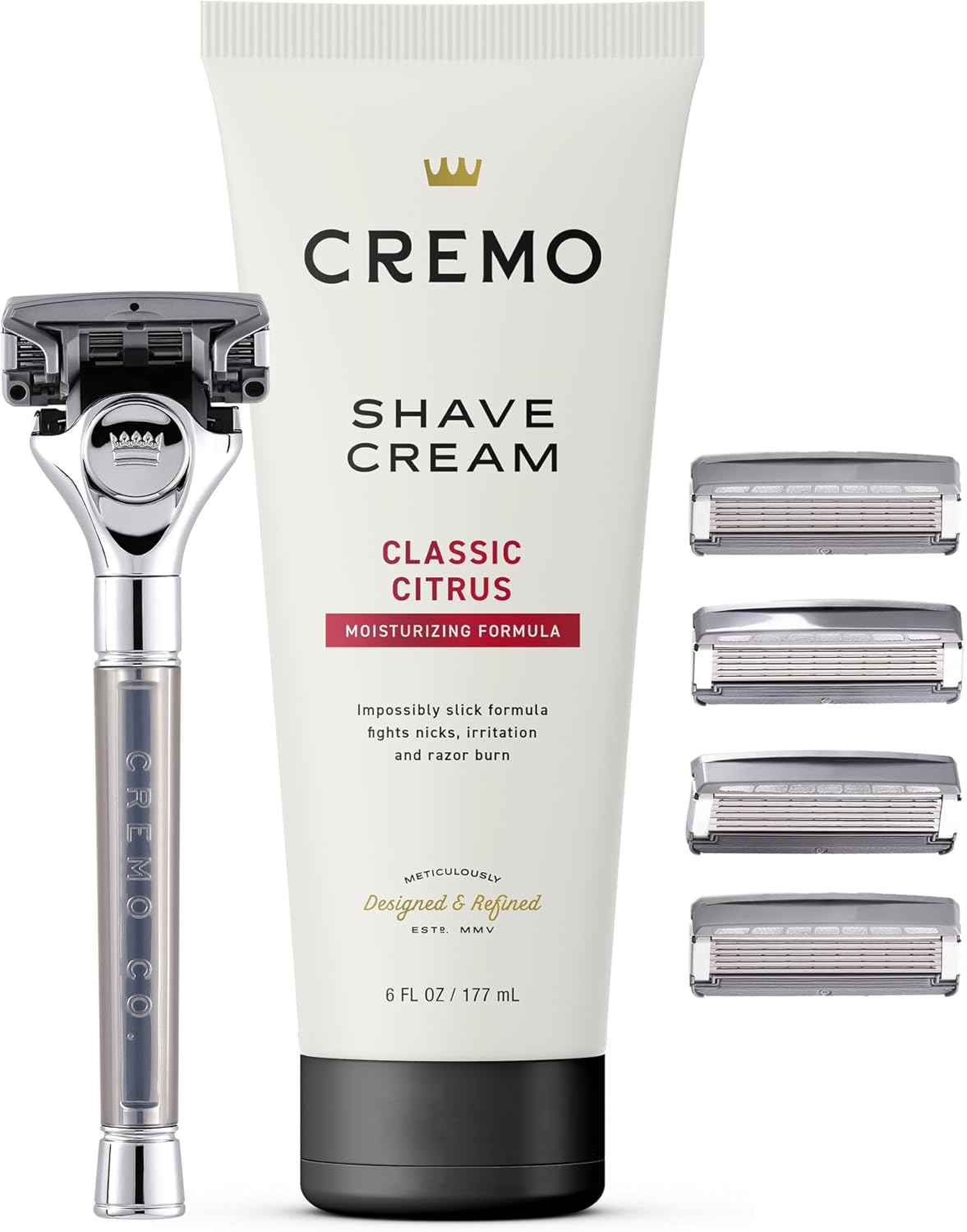 Are you tired of the razor burn that comes with shaving? We were too. That’s what inspired us to create this Cremo Original Shave Gift Set for men. This premium shave kit includes our handsome chrome Barber Grade Razor, four refill cartridges, and our impossibly slick, highly concentrated, moisturizing Original Shave Cream. Experience an exceptional shave with these Barber Grade quality products meticulously designed to fight nicks, irritation, and razor burn. Let your blade glide effortlessly and protect your skin to get a smooth, close shave in the comfort of your own home. There’s no shave like a Cremo shave. Close and comfortable – unquestionably Cremo.