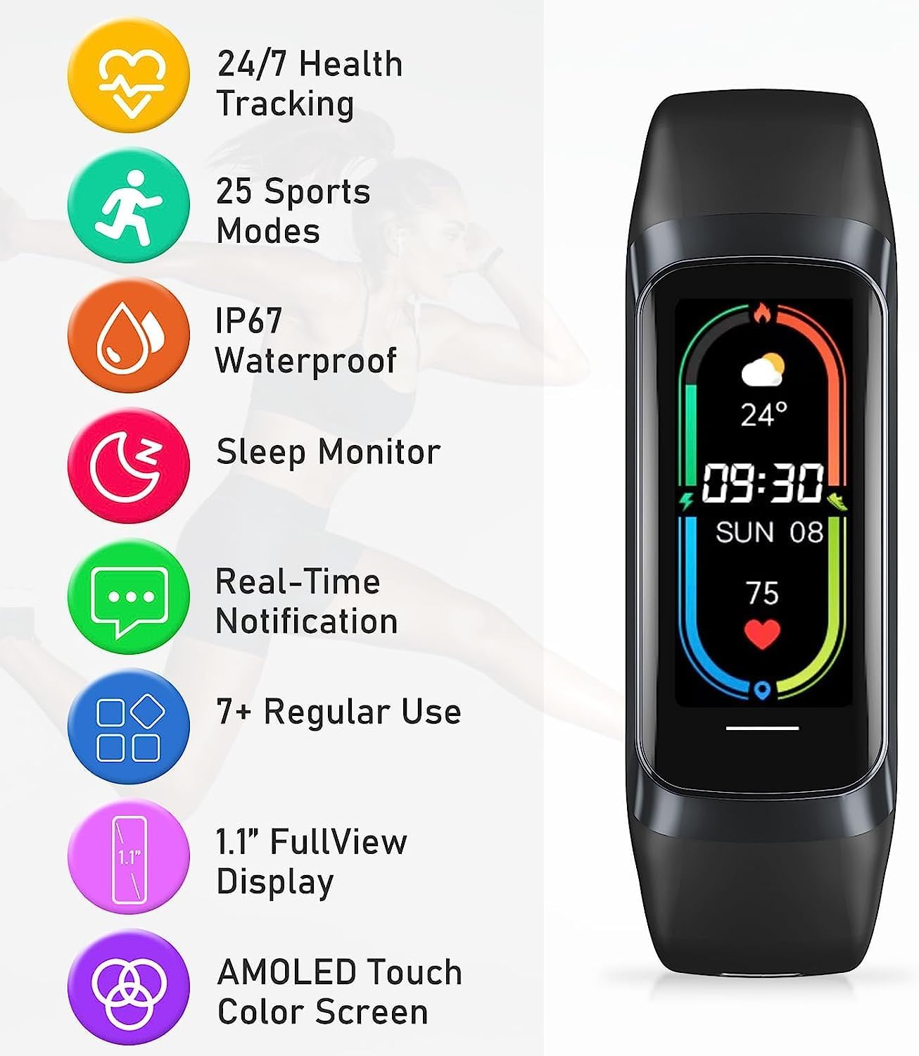 Fitness Tracker with Heart Rate Monitor, Step Counter, Sleep Monitor Calorie Tracking, Activity Tracker with 1.1″ AMOLED Touch Color Screen, Waterproof Step Tracker for Android iPhon Women Men, Black