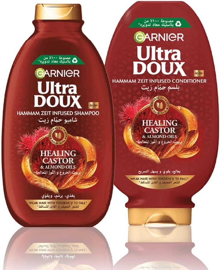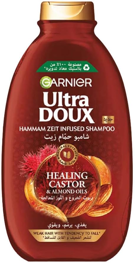 Garnier Ultra Doux Healing Castor & Almond Oils Shampoo: Inspired by Hammam Zeit rituals, discover the powerful new recipe to reinforce weak hair with tendency to fall. We selected 2 precious ingredients, Strengthening Castor Oil & Nourishing Almond Oil, to create an exceptionally healing blend.