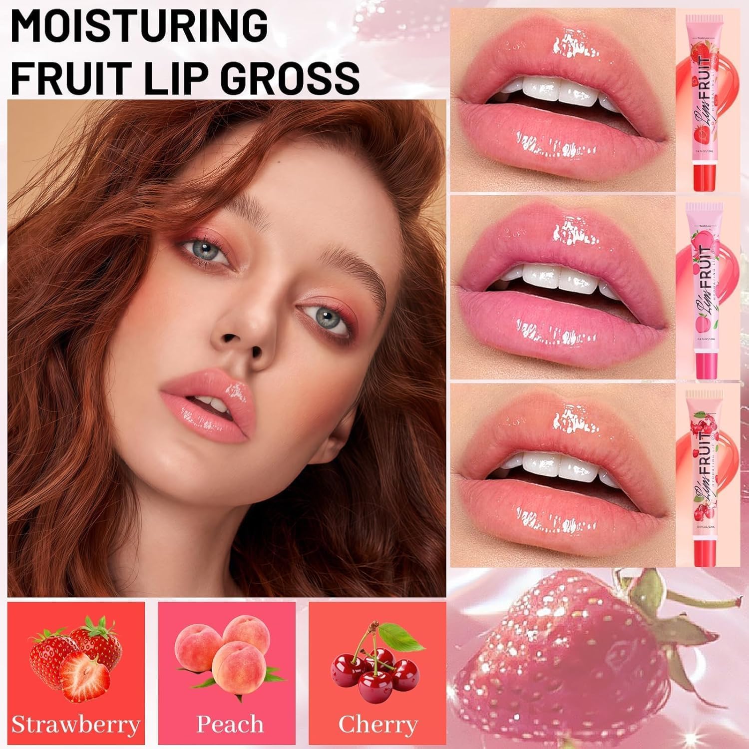 【Fruit-Flavored Lip Gloss Set】: This set includes three delightful flavors: strawberries, peaches, and cherries. Select your preferred flavor to complement your makeup look. The fruity aroma enhances the appeal, while the gloss hydrates, plumps, and beautifies your lips.