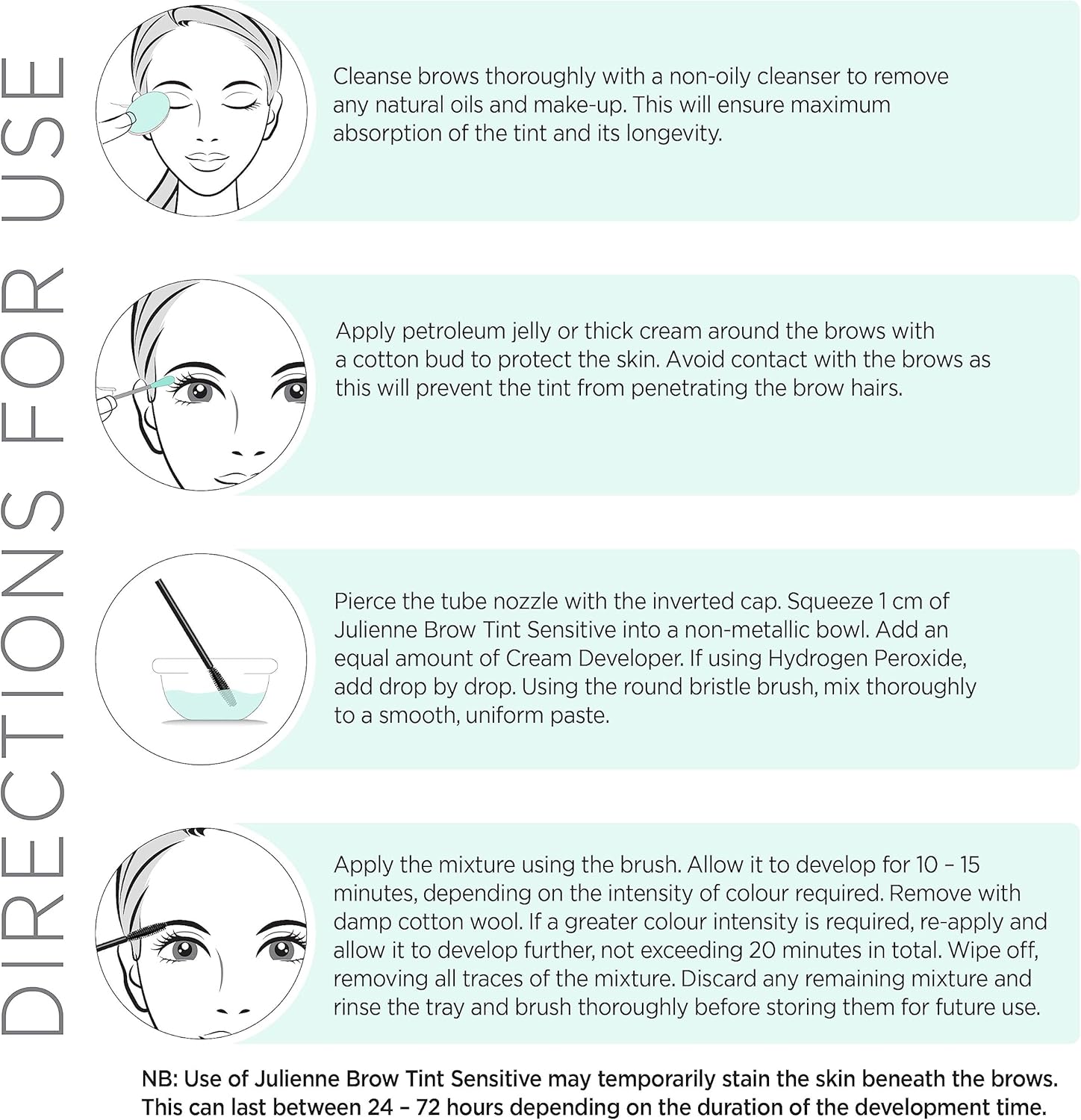 Julienne’s all-inclusive Brow Tint Sensitive is the ideal solution for long-lasting brow colour and definition. It’s the simplest, most affordable way to achieve salon results at home and is safe and easy to use. Julienne Tint comes in 3 versatile colours: Midnight Black – a vivid, luscious black for very dark brown or black hair, and for creating a striking, dramatic look. Dark Brown – a versatile, rich brown pigment which covers the full spectrum of brunettes. Light Brown – a gentle brown ideal for enhancing those with blond, auburn or grey hair. The rich pigments deliver colour intensity, which is easily enhanced or tempered through development time, customised to complement your unique skin tone. Sufficient for 36 applications, the water-resistant and smudge-proof formulation delivers beautifully defined brows 24/7 and lasts up to 21 days. Cream Developer is not included and will need to be purchased independently. Alternatively, you can make use of 10 Volume Hydrogen Peroxide. Use of Julienne Brow Tint Sensitive may temporarily stain the skin beneath the brows. This can last between 24 – 72 hours depending on the duration of the development time. The Julienne Sensitive formulation is ammonia and PPD free. All Julienne products are vegan and cruelty-free.