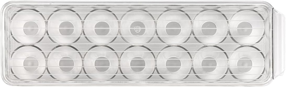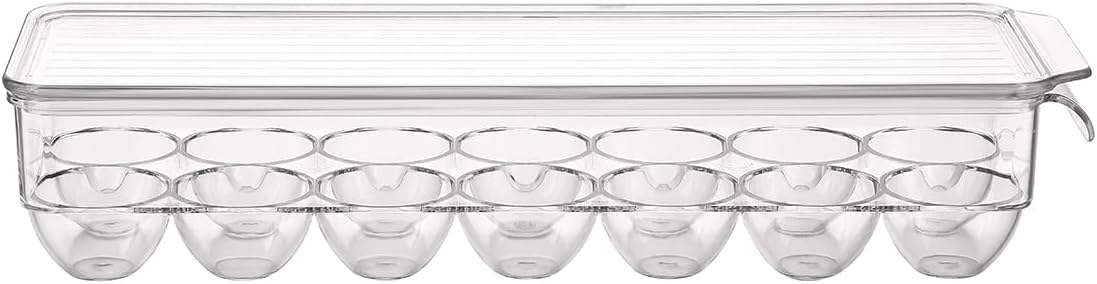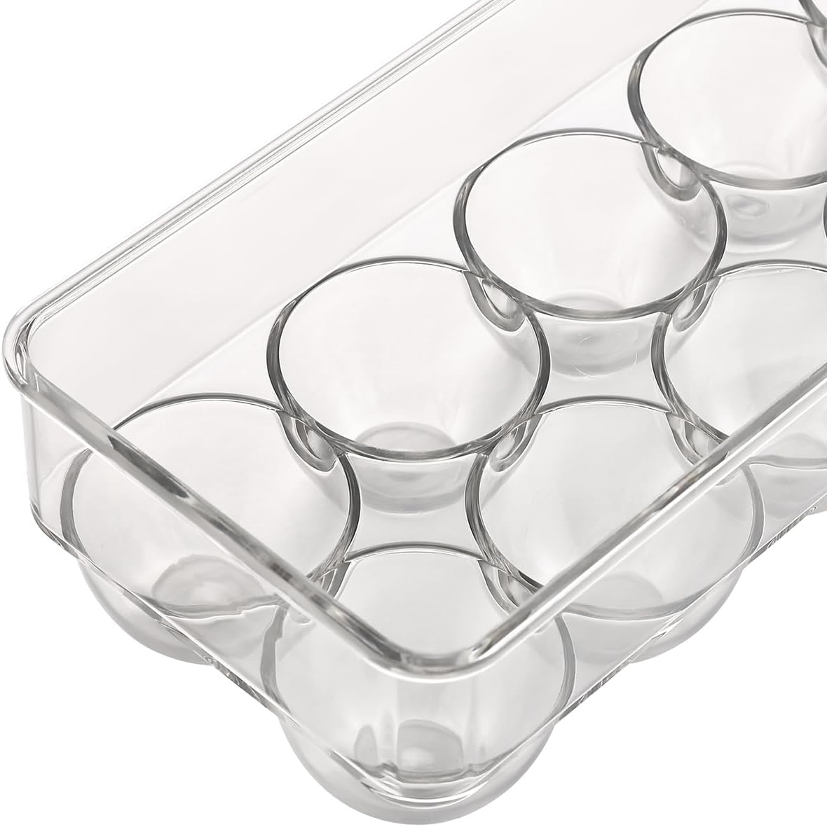 Each compartment is shaped to prevent rolling or contact between eggs, reducing the risk of cracking. This feature makes the tray ideal for keeping fragile eggs in place during routine fridge access. Its clear, neutral finish integrates seamlessly with other acrylic organizers, contributing to a clean, consistent storage system. This egg organizer helps maintain an orderly fridge while maximizing shelf space.