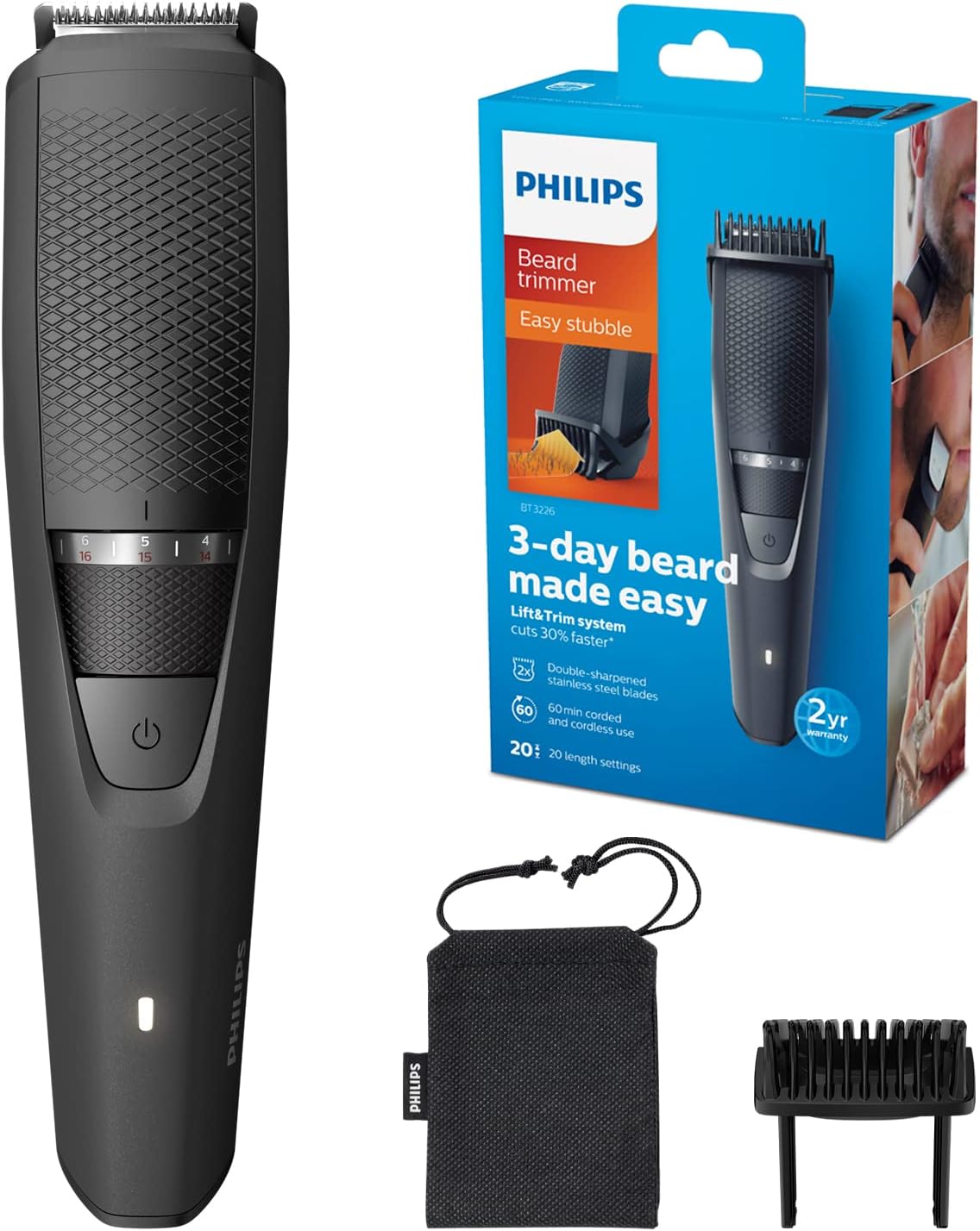 Philips Beard Trimmer for Men, Series 3000, 20 Length Settings, Self-Sharpening Metal Blades, UK 3-Pin Plug – BT3226/13