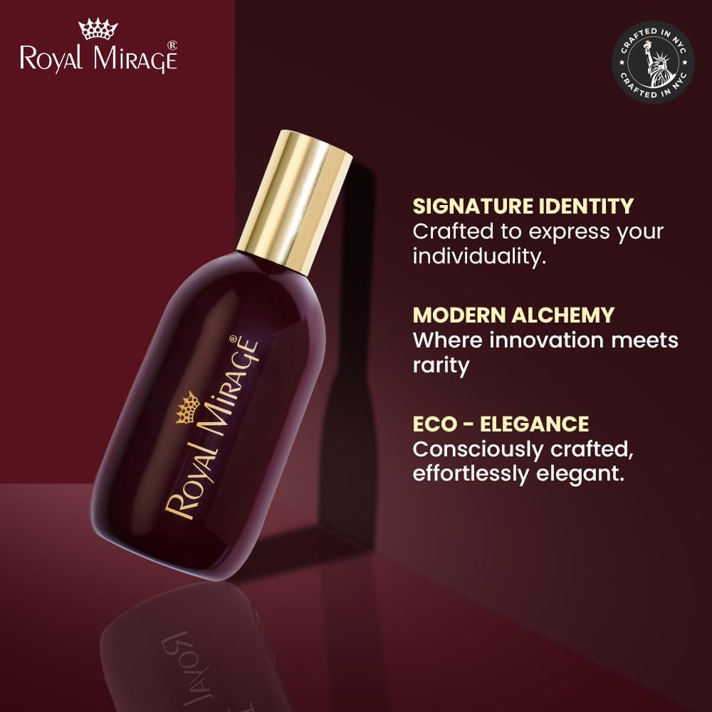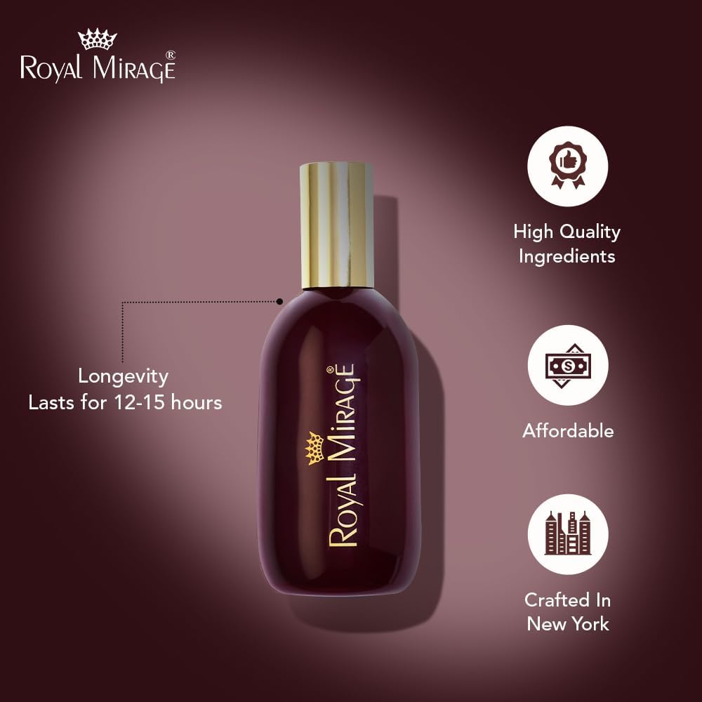 Royal Mirage Eau de Cologne is a floral and fruity scent. This Royal Mirage fragrance is available in a 120ml bottle and can be worn on any occasion.If you want to stay fragrant and fresh all day long, then get your hands on the Royal Mirage Eau de Cologne by Royal Mirage. This light fragrance has a subtle aroma that will remind you of the beautiful gardens found in the countryside. In the top notes of this fragrance, juicy accords of bergamot are present that combines with the fresh and lively nuances of green notes. The heart is enwrapped in the sweetness of florals. Furthermore, this Royal Mirage fragrance ends on the warm and cozy notes of amber, patchouli, and sandalwood that keep your senses calm and confident. The sparkling combination and aura of this scent will surely get your precious one s attention. An excellent pick for a fashionable and chic personality, this perfume is available in a 120ml bottle that exudes class and sophistication. A mild spray of this fragrance on your skin and you are ready to win over all the lovely hearts around you. Top Notes This Royal Mirage perfume opens with the zesty and fruity notes of bergamot that diffuse with the fresh accords of luscious greens. With the brilliant fusion of all these ingredients, the fragrance radiate is alluring redolence, which is hard to resist. Middle Notes The heart of this Royal Mirage Eau de Cologne is ruled by the floral aroma of fresh flowers that adds sweetness to this composition. This pleasing aroma will be a fantastic pick to make your special occasion cozy and light. Base Notes The base note of this Royal Mirage fragrance infuses calm into your senses with the woody, warm, and comfortable notes of amber and sandalwood. Patchouli has a sweet, dark, and earthy facet that pleases your senses. This fragrance leaves a vibrant yet sensual aroma that creates a special place in your better half s heart.