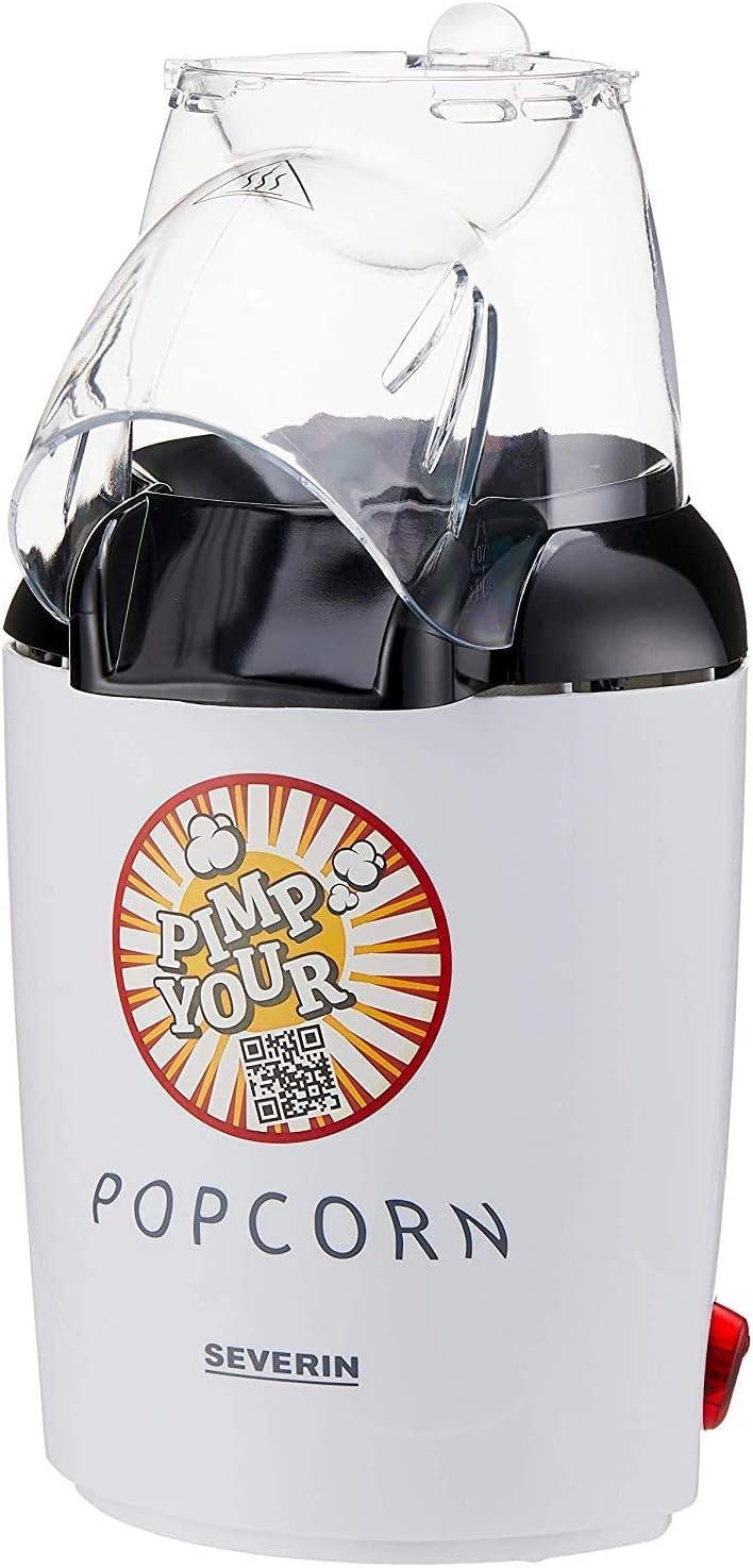 Severin Popcorn Maker prepares popcorn with hot air in approx. 2.5 min. Transparent lid with integrated filling scoop. On-off switch with pilot light. A healthy way of making popcorn. Cleverly designed kernel scoop fits into the lid when not in use.