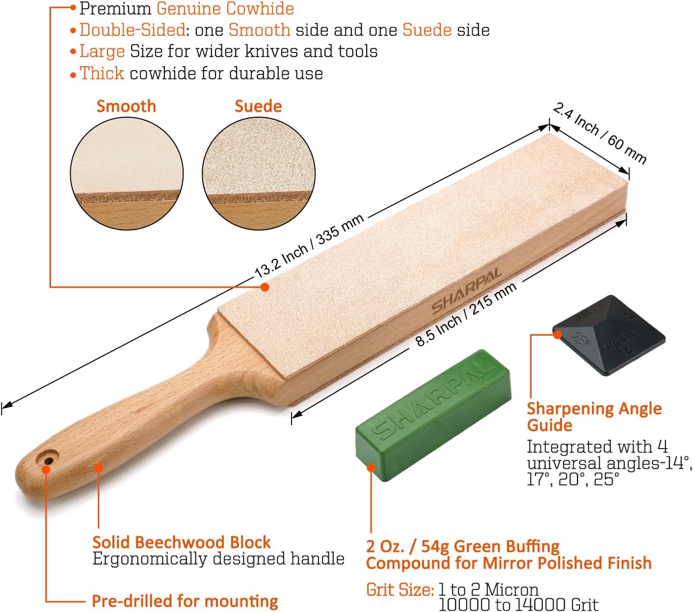 SHARPAL 205H Double-sided Leather Strop (Genuine Cowhide) 13.2″ x 2.4″ Kit with 2 Oz. Polishing Compound & Angle Guide, Knife Stropping Block for Sharpening & Honing Knives tools, Woodcarving Chisels