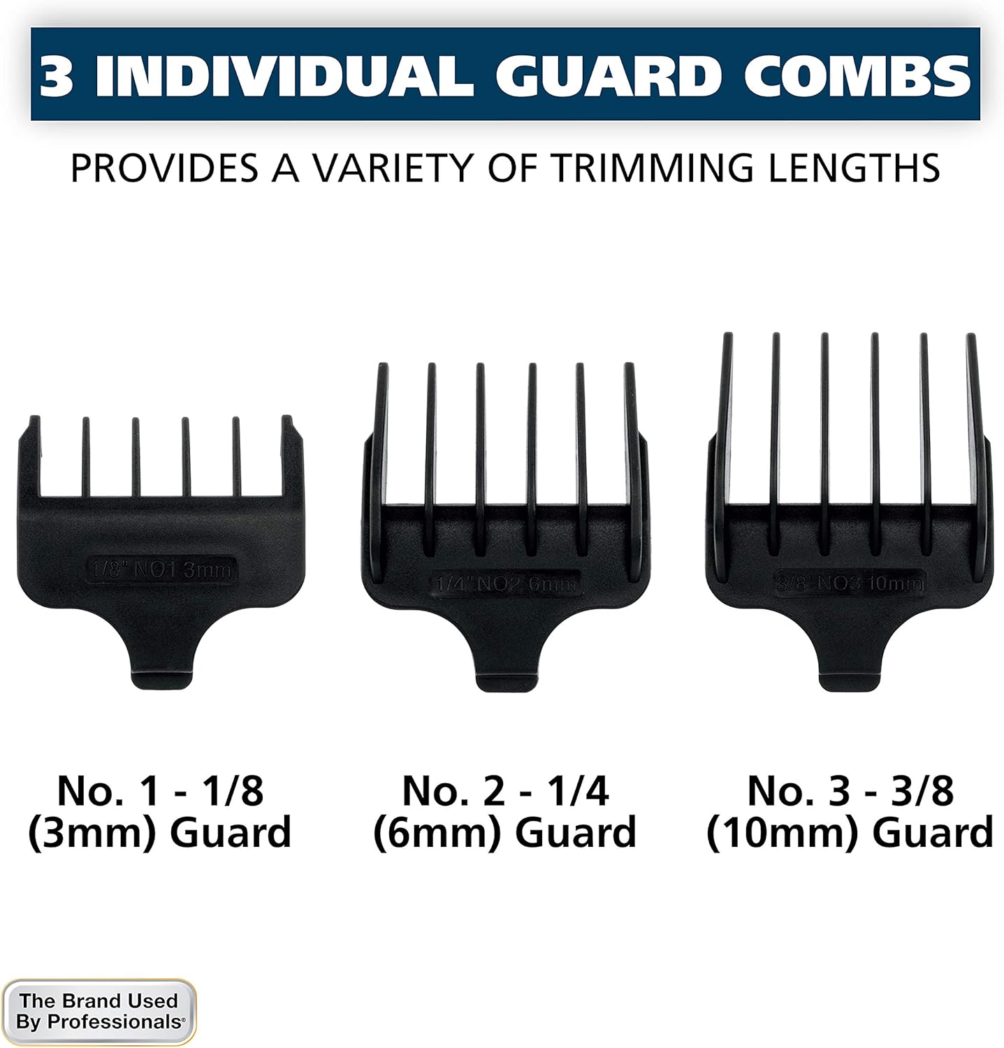 3 Individual Beard Guards – This 7 piece trimmer kit features 3 individual beard guards from 1/8”, 1/4”, to 3/8”, a beard comb, and English and Spanish instructions