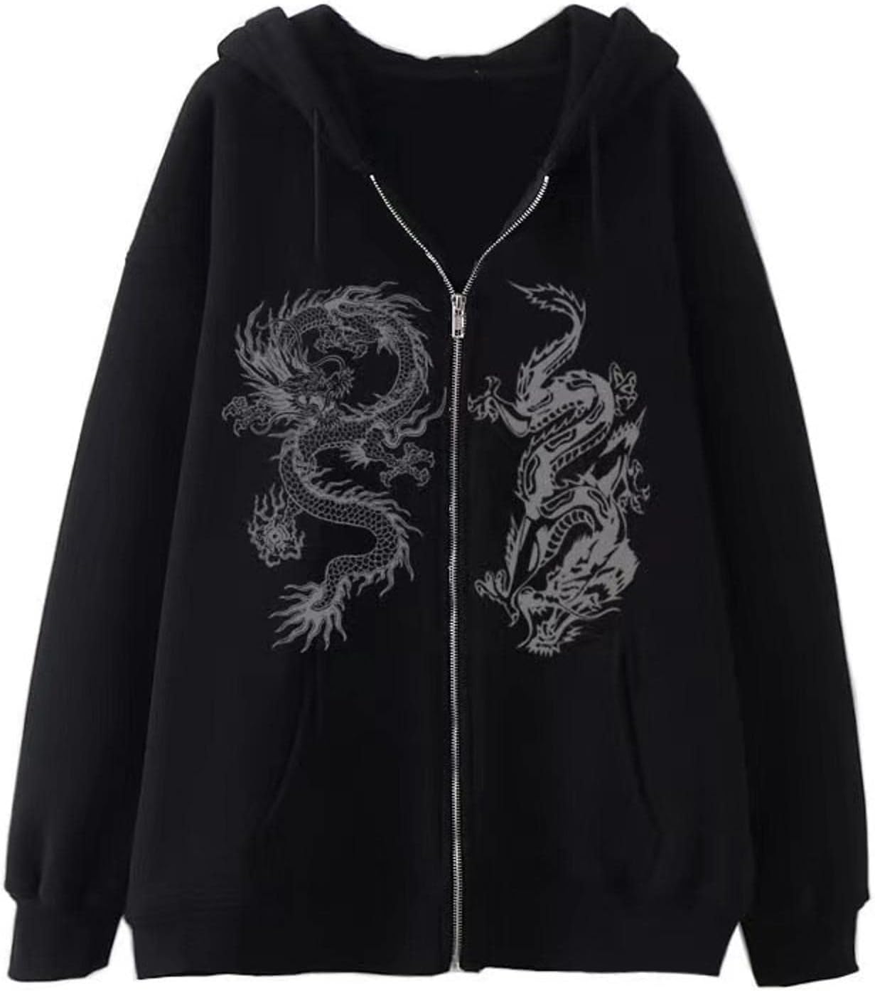 Features: dragon print hoodie, zipper, fleece, fashion loose